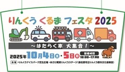 「りんくうアイスパーク芝生広場」にはたらく車が大集合! 消防車やパトカーと写真を撮ったり、ステージのジャンケン大会でお菓子をゲット! 家族で楽しめる2日間です! (曜日によりコンテンツが一部変わります)