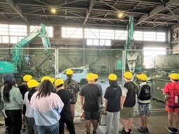 当日参加者は、まず座学で、自動車が解体されてから部品や資源が回収されるまでの一連の工程を学びました。次に工場へ移動し、エアバッグを適切に処理する様子や、重機で車両を解体・破砕する様子のほか、最終的に回収された金属資源などを見学しました。