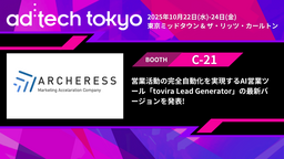 株式会社アーチャレス (本社: 東京都新宿区、代表取締役: 石原強、以下 アーチャレス) は、2025年10月22日 (水)~24日 (金) に東京ミッドタウン&ザ・リッツ・カールトン東京で行われる「ad:tech tokyo 2025(以下、アドテック東京)」に出展することをお知らせいたします。