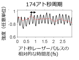 ΔTは2つのアト秒パルスの時間間隔を変えるときの時間ステップ、Tは相対的な2つのアト秒レーザーパルスの時間差です。この測定では時間ステップサイズが700ゼプト秒(1ゼプト秒=10-21秒)から増加しており、この方法を用いて、ゼプト秒時間間隔での測定の応用も期待されます。
