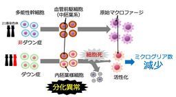 ダウン症は、通常2本ある21番染色体が3本になることで発症する染色体異常症で、ほとんどの方に知的障害が見られることが知られています。この知的障害の背景には、胎児期における脳の発達の遅れが関係していると考えられていますがその詳しい仕組みはまだ解明されていません。これまで研究チームは、ダウン症モデルマウス(Ts1Cjeマウス)の胎仔脳で、ダウン症胎児と同様に神経の発生が低下していること*1、また一方では、脳の免疫細胞である脳マクロファージの数が減っていることを報告してきました*2。しかし、なぜ脳マクロファージの数が少なくなるのかは不明でした。