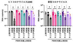 ①R-1 EPSで刺激したヒト末梢血単核細胞※3(以下、PBMC)の培養液をヒト肺由来培養細胞に加えて培養することで、ヒトコロナウイルス229E※4および新型コロナウイルスの増殖が抑制されました。