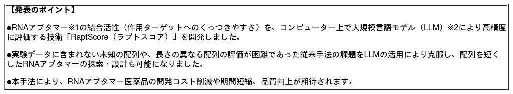 AIでRNAアプタマー創薬を効率化する技術「RaptScore」を開発 ~任意のRNAアプタマーの結合活性を評価する技術で創薬を加速~