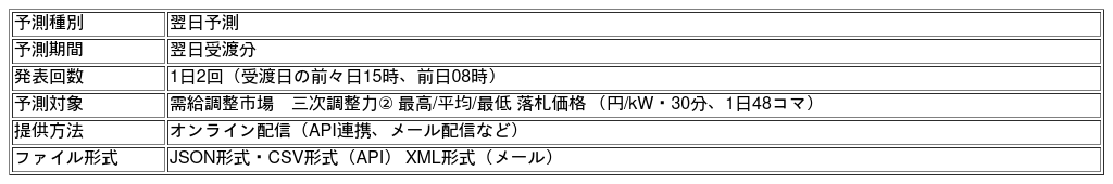 「需給調整市場価格予測」の提供仕様は以下のとおりです。