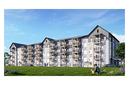 本物件は約13エーカー(約52,600m²)の敷地内に総延床面積 27,371m²の賃貸用集合住宅6棟を開発するものです。住居棟の周辺に庭や緑地を設け、自然を感じる静かで落ち着いた住環境を提供します。住居棟とは別に開発する共用施設にはコワーキングスペースやフィットネス、プールなどを設けます。