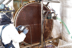当社では、お客様のプラント定期修理工事おける効率化を目指し、これまでに内面自動洗浄機などの独自の改良とテストを繰り返し実施してきました。今回の技術導入により従来の手作業に比べて作業時間は最大20%短縮(当社比)しており、プラント稼働停止中に行われる作業の工程短縮や、品質の向上を目指してまいります。
