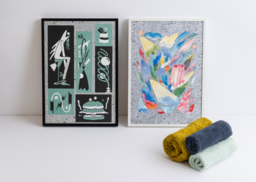 再生したボードには、プロジェクトに賛同するアーティストの作品を高精細プリントで表現。コットン素材の繊維の表情や端材形状の違いにより、ひとつひとつ微細な個性が生まれるため、同じものは二つとありません。インテリアとしてもアートとしても楽しめる、ユニークで特別なプロダクトに仕上がります。