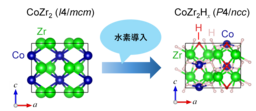 また、遷移金属ジルコナイドは水素をよく吸蔵することが知られており、水素吸蔵材料の側面としても注目されてきました。水素吸蔵は物質の性質を変化させることもあり、特にCoZr2超伝導体は水素を吸蔵することで電子状態が大きく変化し、低温で遍歴性[6]の強磁性状態へと転移することが報告されていました。一方で、結晶構造は水素の吸蔵でほとんど変化せず、正方晶系の空間群[7]I4/mcm (#140)から同じ正方晶系のP4/ncc (#130)へと変化します(図1)。水素を吸蔵したCoZr2Hx (0 ≤ x ≤ 5)の結晶構造がc軸負熱膨張を示すCoZr2とほとんど同一であることから、P4/nccの構造を有するCoZr2Hxにおいてもc軸負熱膨張が発現することが予測されます。