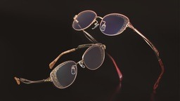 テンプルの透かし彫りとヨロイに配した色とりどりの宝石が優美な輝きを放ちます。このコレクションにHOYAのレーザー技術「 Glint Veil 」がコラボレーションすることで、レンズ面からサイドにかけて流れるような統一感のある表現となりました。