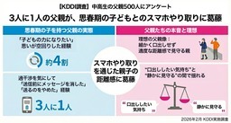 KDDI株式会社は、思春期の中学1年生~高校3年生の子どもを持つ全国の父親500人を対象に、親子に関するアンケート調査を行いました。調査の結果、約4割の父親が「子どもの力になりたい」という思いが空回りしてしまった経験があると回答。また、過干渉と思われることを気にして「送信前にメッセージを消した」「送るのをやめた」父親も3人に1人にのぼり、スマホ返信を通じた親子の距離感に葛藤している実態が明らかになりました。