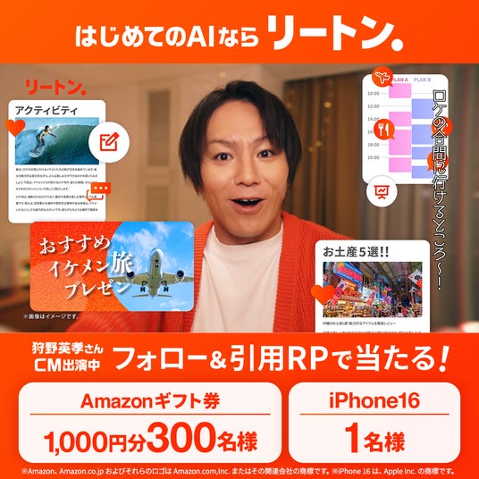 狩野英孝さんのWEB CM公開を記念して、キャンペーンを開催します。リートン公式Xアカウントをフォローして参加するSNSキャンペーンや、「リートン」でアカンウト登録、AIキャラとチャットを楽しむだけで応募可能なキャンペーンになっています。iPhone16をはじめとする豪華プレゼントが総勢1,000名様に当たるチャンス!この機会にぜひ、ご参加ください。