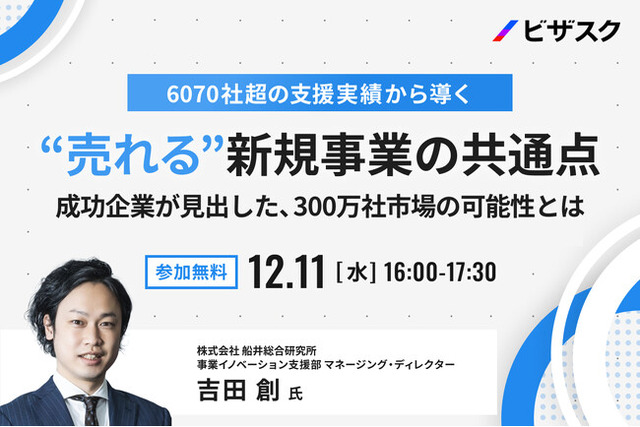 「知見と、挑戦をつなぐ」をミッションにグローバルなナレッジプラットフォームを運営する 株式会社ビザスク(以下、当社)は、「6070社超の支援実績から導く “売れる” 新規事業の 共通点」をテーマに、船井総合研究所氏 事業イノベーション支援部 マネージング・ ディレクター 吉田 創ご登壇による無料オンラインセミナーを 12/11 (水) 16時より開催します。 ◆詳細・お申込み: https://visasq.co.jp/seminar/newbusiness1211?utm_source=prtimes&utm_medium=referral&utm_campaign=seminar_expert_20241211