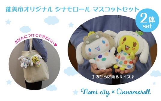 能美市オリジナル「シナモロール」と能美市公式キャラクター「ゆず美ん」のマスコットセットをふるさと納税返礼品に追加しました。能美市章の3色(オレンジ、青、緑)の水玉模様入りのスカーフを巻いたオリジナル「シナモロール」です。能美市公式キャラクター「ひぽ能ん」をモチーフにした被り物がキュートなデザインです♪