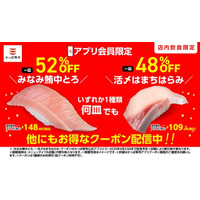 お得なクーポン全7種、延長&追加クーポン決定!『みなみ鮪中とろ』、『活〆はまちはらみ』、『苺のふんわりチーズムース』、『赤貝』など全9種が、いずれか1種類何皿でも今だけお得に楽しめる