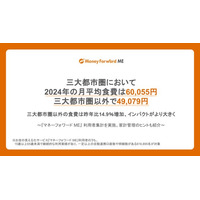 2024年の月平均食費は、三大都市圏において60,055円、三大都市圏以外で49,079円。三大都市圏以外の食費は前年比14.9%増加、インパクトがより大きく