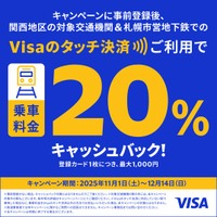「Visaのタッチ決済で鉄道がお得!20%キャッシュバックキャンペーン」を関西エリアと札幌市内の鉄道事業者で11月1日より開始
