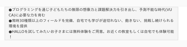 この「AIに取って代わられない」領域においてプログラミング教育を通じて育むことができ、子どもたちが未来に向けて活躍するために不可欠なスキルです。HALLOではプログラミング教育を通じて、このスキルを育むことができます。生徒一人ひとりのレベルや学習ペースに合わせた、やる気スイッチグループならではの個別最適化されたレッスンをご提供。他の同級生に先駆けてプログラミングを習得することで自信を持ち、“得意”を見つけられることにより学校で楽しく過ごせるきっかけとなります。現在、HALLOでは教室でもご自宅(オンライン)でも受講可能な無料体験授業を実施中です。また、この冬には「ウィンターチャレンジ2024」と題して短期間でプログラミングを習得できる講習会を開催します。(https://bit.ly/3O5iNIM)ぜひこの機会に未来に向けたスキルを身につけましょう。