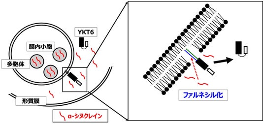 YKT6が多胞体に結合し多胞体が形質膜に癒合して多胞体内の膜内小胞を放出するが、増加したα-シヌクレインがYKT6のファルネシル化を阻害し膜結合が減少する。結果として放出されるエクソソームが減少し、細胞内にα-シヌクレインが蓄積する。