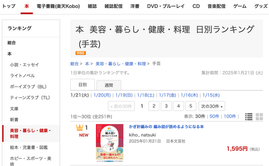 ★楽天ブックス週間ランキング(手芸部門)で1位を獲得しました!(2025.1.21)