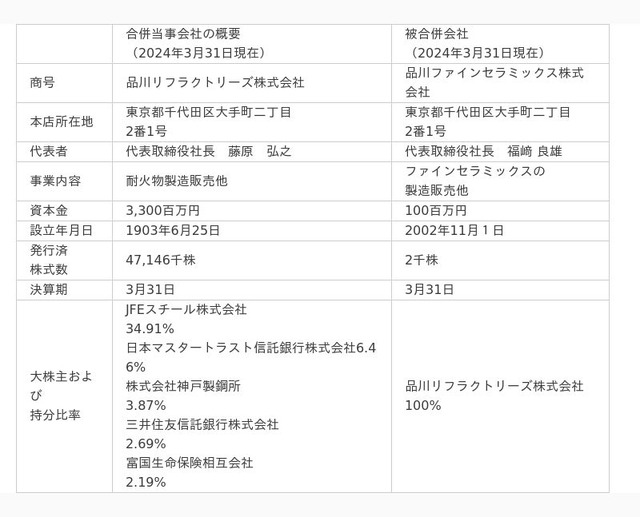 (注)当該合併につきましては、品川リフラクトリーズ株式会社は簡易合併(会社法第796条第2項)し、品川ファインセラミックス株式会社は略式合併(会社法第796条第1項)に該当するので、合併契約書承認に関する株主総会は開催いたしません。