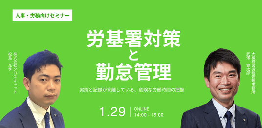 今回そうしたサービス提供をする中で培ってきた知見を活かし、大槻経営労務管理事務所と共催で、労基署調査(臨検)対策の必要性の理解、そして違反指摘を未然に防ぐ方法に焦点を当て、危険な労働時間の把握とその対策について解説します。コロナ禍や2024年問題などを発端に働き方が多様化した今、労基署がチェックしているポイントと勤怠管理テクノロジーを知ることで、違反指摘を未然に防ぐためのノウハウを得ることができますので、この機会にぜひご視聴ください。