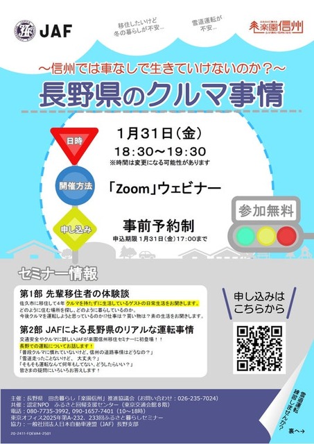 移住を想定している方の雪道運転と移住への不安を解消することが目的です。本セミナーは2部構成です。1部では長野県庁が、「先輩移住者からの体験談を聞く会」を開催します。2部では長野県内での道路情報や冬の時期の雪道運転などについて、JAF長野支部が解説します。