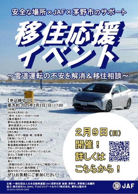 一般社団法人日本自動車連盟(JAF)長野支部(支部長 宇都宮 進一)は 、県庁および茅野市と協力し、長野県への移住希望者をサポートする2つのイベントを開催します。