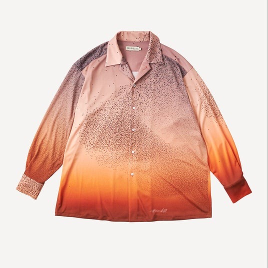 ビビッドなオレンジの夕空にムクドリの大群が舞い飛ぶ自然現象「ソートソル」を全面にプリントしたシャツ。ユニフォームなどに使用されるジャージ素材を採用し、伸縮性・速乾性に優れたリラックスイージーケアアイテム。