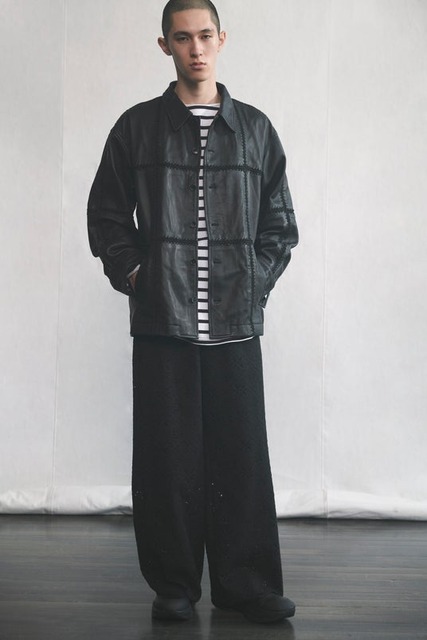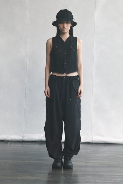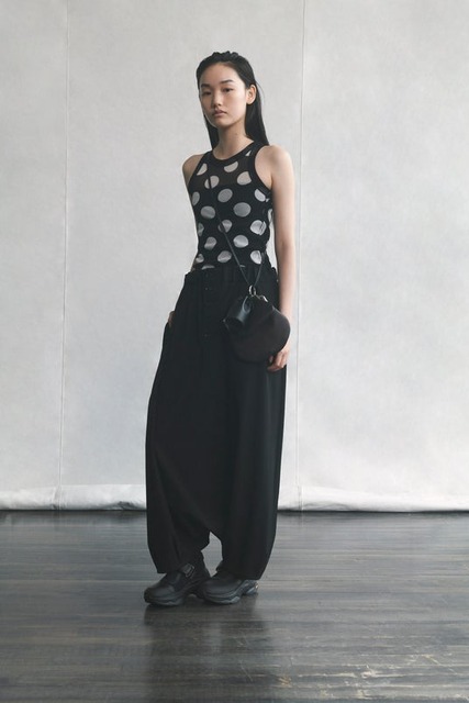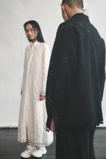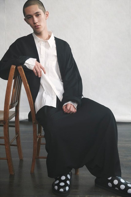 ワイズらしい造形と、レースやボーダー、ドットなど確立された様式や柄、黒と白の色構成など不変の要素を服に纏め、素直に表現する──ニュートラルな印象とディテールのつくり込みが共存する「Y's....」。削ぎ落とされたフォルムに、独特の存在感を持つシルエット。