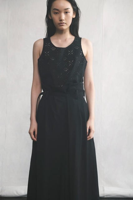 袖なしの前開きドレスに細身のロングシャツを重ねた白のスタイルと、胸ポケット付きのシャツにドローストリングパンツを合わせた黒のスタイル。コットンレースの印象がつくる、ヘルシーなレイヤードスタイル。