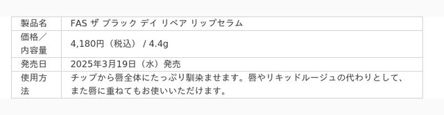 株式会社シロク(本社:東京都渋谷区、代表取締役社長:飯塚勇太)は、発酵エイジングケア※1 ブランド「FAS(ファス)」より、「FAS ザ ブラック ナイト リペア リップマスク」と「FAS ザ ブラック デイ リペア リップセラム」の2製品を2025年3月19日(水)より発売いたします。