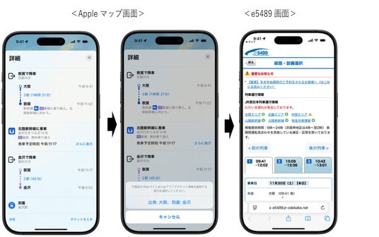 Appleマップの経路検索での検索結果に、北陸新幹線(敦賀~上越妙高、または敦賀~糸魚川発の東京方面)、サンダーバード(敦賀~大阪)、しらさぎ(敦賀~名古屋)が含まれる場合、「チケットを入手」ボタンから検索した乗車区間・日時を保持したまま「e5489」に遷移し、スムーズにきっぷの予約・購入ができます。