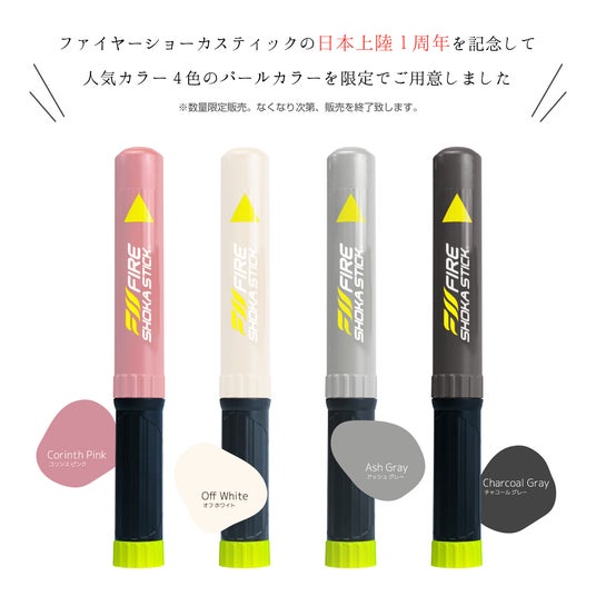 今回はファイヤーショーカスティック日本上陸1周年を記念し、「カラーセレクション」で特に人気の高いコリンス ピンク、オフ ホワイト、アッシュ グレー、チャコールグレーにパールを加えた特別なカラーリングの「パールエディション」全4色を、数量限定で販売致します。