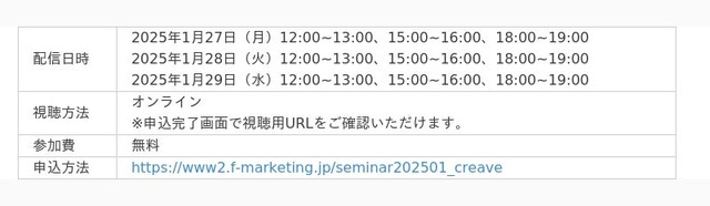クリエイターとの共創を通じて企業のマーケティング課題を解決する、株式会社CREAVE(本社:東京都千代田区、代表取締役社長:中村真奈、以下 CREAVE)は、株式会社ファン・マーケティング(本社:東京都渋谷区、代表取締役社長:藤井 一晃、以下ファン・マーケティング)との共催セミナーアーカイブ配信を1月27日(月)、28日(火)、29日(水)の全9枠で配信いたします。
