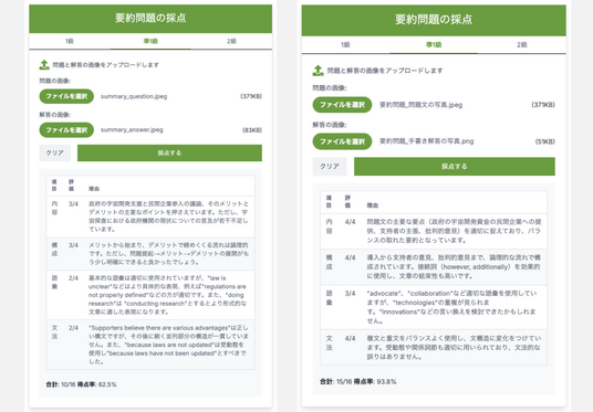 本文が長文になりがちで、テキスト化が面倒な要約問題においても、画像アップロード形式を採用。スマホで撮影した手書き解答をそのままAI評価にかけることで、受験生の負担を大幅に軽減します。