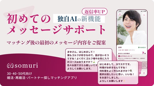 「初めてのメッセージサポート」は、マッチングした相手に初めて送るメッセージ内容を独自AIが提案する機能です。二人の共通点や相手のプロフィール情報に基づき作成されるため、相手が返信しやすい内容となっています。自分らしさが加わるように編集してから送信することを推奨しています。本機能をご利用いただくことで、せっかくマッチングしたものの、一通目のメッセージ内容で相手への印象を下げたり、メッセージ送信のタイミングを逃すなど、出会いのチャンスを逃すリスクの最小化を目指しています。今後も「Somuri(ソムリ)」は、利用者の皆様により良いマッチング体験をお届けするため、機能改善を行ってまいります。