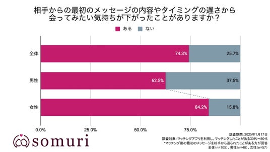 また、「相手からの最初のメッセージの内容やタイミングの遅さから、会ってみたい気持ちが下がったことがありますか?」との質問には、全体では74.3%が「ある」と回答しました。男女別では、女性は84.2%、男性は62.5%が「ある」と答え、女性の方が高い結果となりました。一通目のメッセージの内容やタイミングが、その後二人の関係が進展するかどうかに影響を与えていることが分かりました。具体的なエピソードを募ったところ、以下のような回答が得られました。