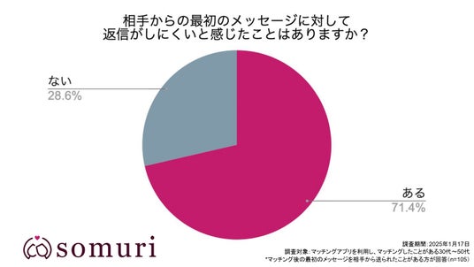 次に、受信側の立場から「相手からの最初のメッセージに対して、返信がしにくいと感じたことはありますか?」との問いに対して、全体では71.4%が「ある」と答えました。(女性:77.2%、男性:64.6%)