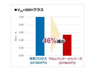 従来プロセスと比較し、Ron・AをVDS=100Vクラスでは39%減、VDS=200Vクラスでは46%減を達成。