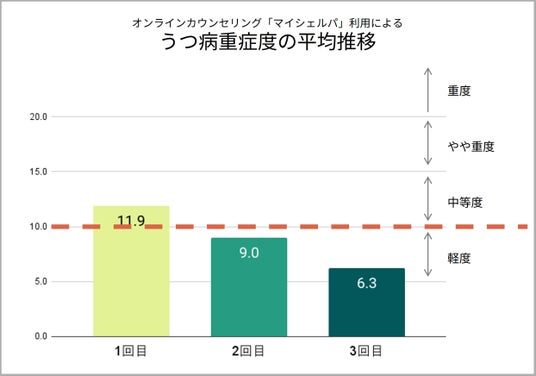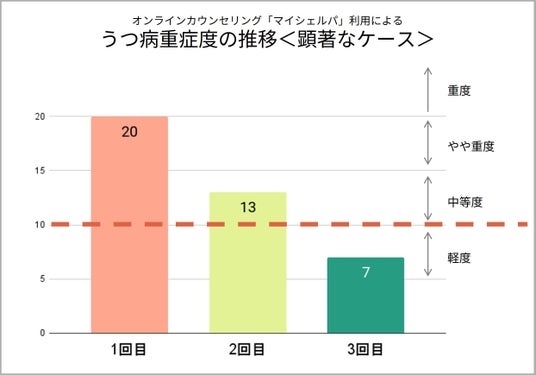 個別事例として、1回目に20点(重度うつ症状)だったスコアが、3回目には7点(軽度)に改善している例もありました。
