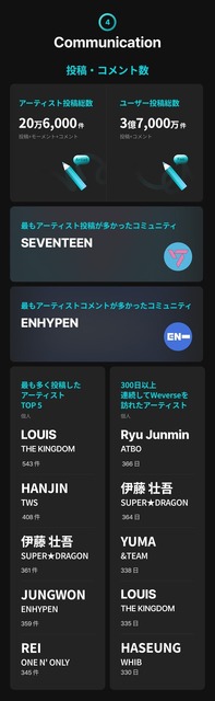2024年の1年で、アーティストによる総投稿数(投稿、24時間限定でいいねやコメントができるモーメント、ファン投稿への返信コメントの合計)は20万6,000件にのぼり、ファンによる総投稿数は3億7,000万件となりました。最もアーティストの投稿が多かったコミュニティはSEVENTEEN、最もアーティストのコメント(ファンへの返信)が多かったコミュニティはENHYPENとなりました。