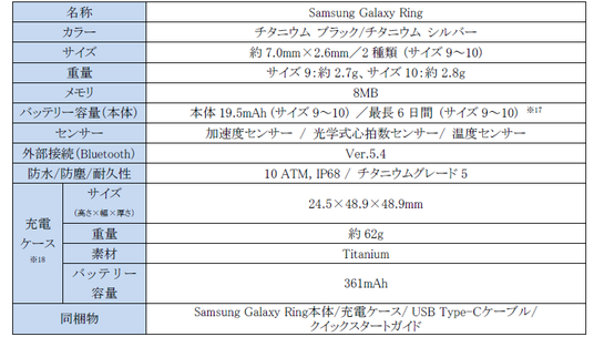 ※17バッテリー駆動時間はサイズによって異なります。定格容量は「Samsung Galaxy Ring」のサイズ5~7で約18mAh(一度の充電でバッテリー駆動時間は最大6日間)です。また使用パターン、使用環境などによって異なる場合があります。