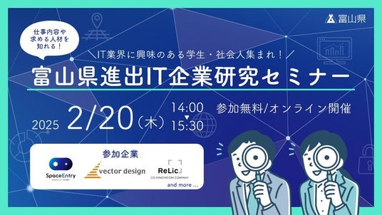 富山県(運営:株式会社Asian Bridge)は、IT業界に興味のある若者や地域の方に、県外から富山県へ進出した(または進出予定の)IT企業4社のことをより知ってもらうため、進出IT企業研究セミナーを開催します。