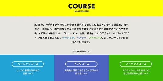 2025年のXデザイン学校は進化します。「ヒューマン、企業、社会」という三方よしのビジネスデザインを実践するために、「ベーシックコース」ではしっかり基礎を学び、「マスターコース」ではより実践的に活用できるように、「アドバンスコース」では、プロフェショナルに向けての学びを深めていきます。コース名は昨年と同じですが、大きな変化を考慮して内容をアップデートします。