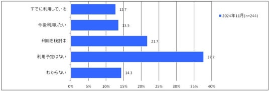 生成AIなどに利用されるGPUサーバーや高速な計算・解析を行うHPCサーバーなどの、高発熱・高排熱サーバー、高負荷サーバーの利用状況と利用意向を聞いたところ、「すでに利用している」が12.7%となりました。「今後利用したい」が13.5%、「利用を検討中」が21.7%となり、両者を合わせた利用に前向きな層は34.2%となります。利用中から検討中まで含めて調査対象者の半分が利用に興味を持っている状況です。特に売上規模が1000億円以上の大企業において利用率が30%を越えています。