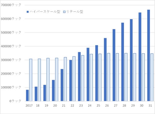 【図表1 ハイパースケール型DC・リテール型DC それぞれの累積ラック数(2017年~2031年)】