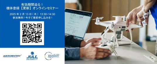 ドローンの関連許認可申請とソリューション開発を専門とするバウンダリ行政書士法人(本社:東京都千代田区、代表行政書士:佐々木 慎太郎)は、無人航空機の操縦に関する教育、指導および資格認定や登録講習機関として国家資格向け講習を展開する日本無人航空機免許センター株式会社(本社:東京都千代田区、代表取締役:松本 篤史、以下 JULC)およびエアロエントリー株式会社(同)と共同でライブ配信オンラインセミナー「有効期間迫る!!機体登録【更新】セミナー」を、2024年2月13日(木)13:30より開催いたします。