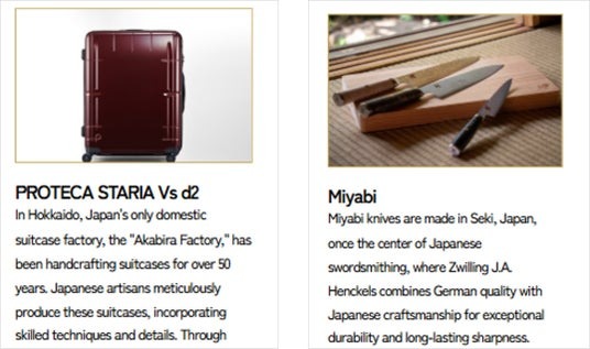 軽量さと機能性、洗練されたデザインを誇る、職人が手作りする「Ace」のスーツケース「プロテカ」、繊細なデザインと100以上の工程数をかけて作る優れた切れ味を誇る「Zwilling J.A. Henckels」の包丁「Miyabi(雅)」など、日本ならではの技術・こだわりを感じていただける日本製ブランド商品を紹介しています。(英語版ページのみ)