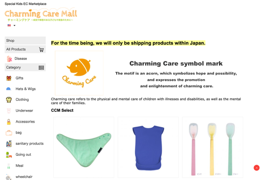 2020年1月、病気や障害があったとしても子どもの可愛らしさ・子どもらしさを尊重するケアという意味を込め“チャーミングケア”と名付け、ECマーケットプレイス「チャーミングケアモール」の立ち上げに至りました。