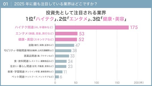 その結果、個人投資家が最も注目している投資先として、1位:ハイテク(AI・半導体)、2位:エンタメ・レジャー(映画・音楽・旅行)、3位:健康・美容(スキンケア・フィットネス)が選ばれていることが明らかになりました。